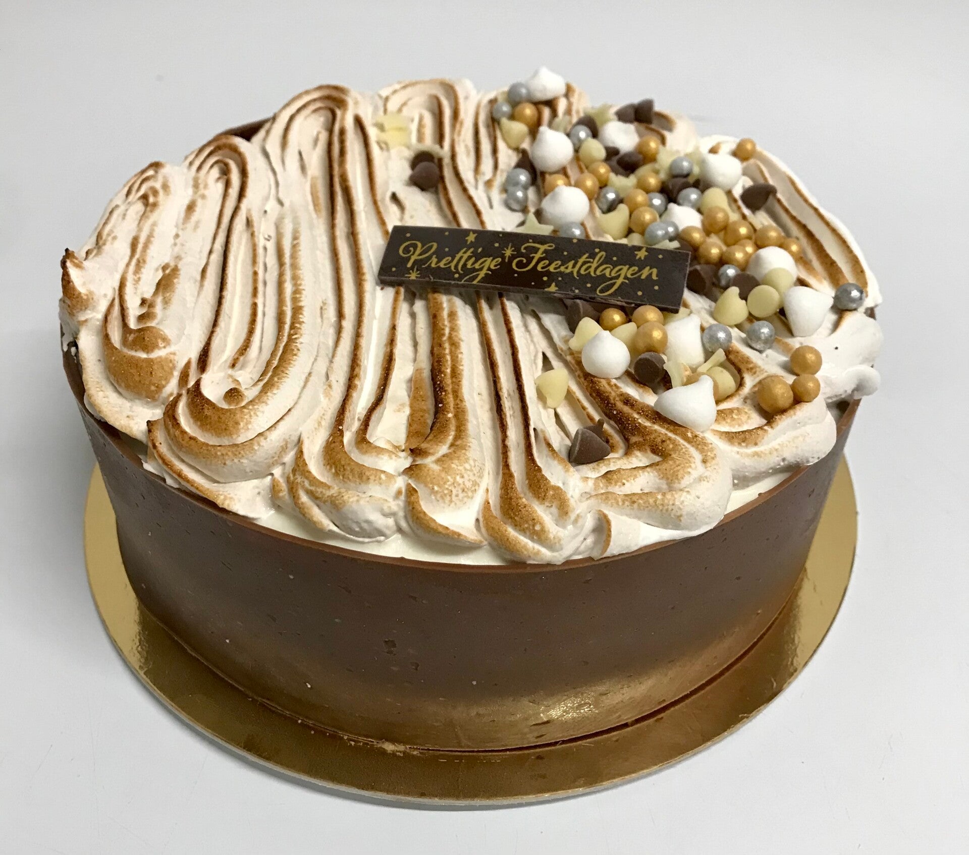 IJstaart met 2 lagen chocolade cake, gevuld met mascapone ijs. Afgewerkt met gelameerde meringue en diverse toppings.